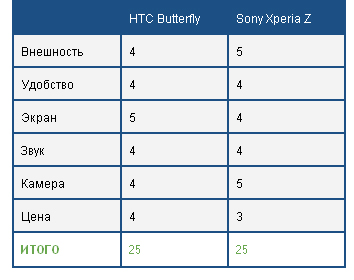 Итого, Sony Xperia Z получает за внешний вид 5 баллов, HTC Butterfly - 4.