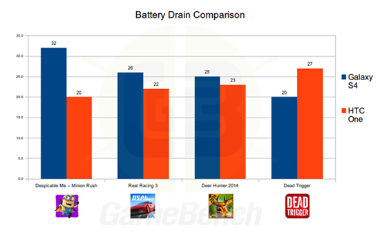 Но за большую производительность за счет простого повышения частоты CPU и GPU приходится платить повышенным энергопотреблением, что показывает вторая диаграмма от GameBench. В ней отражено количество процентов от заряда батареи, потраченное за час игры. Стоит учитывать, что емкость аккумулятора One составляет 2300 мАч, а Samsung Galaxy S IV — 2600 мАч.