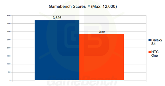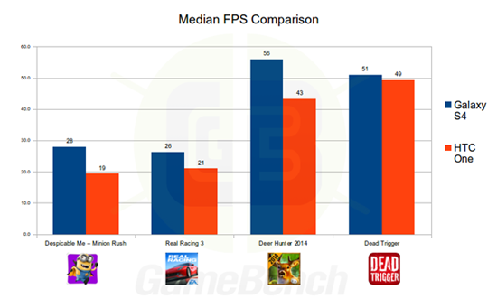 Чтобы показать уже проделанную работу до выхода приложения в Google Play, разработчики GameBench привели результаты сравнительного тестирования Samsung Galaxy S IV (Qualcomm-версии) и HTC One. Сразу хочется заметить, что модель процессора у смартфонов одна, четрехъядерный Snapdragon 600, а максимальная частота каждого ядра разная — 1.7 ГГц у тайваньского и 1.9 ГГц у корейского устройства.