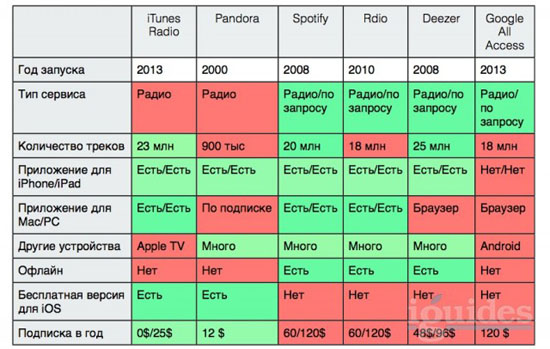 Но iTunes Radio не идеален. В нем нет воспроизведения по запросу, офлайн режима и поддержки неяблочных устройств кроме PC с установленным iTunes. Редакция iGuides сравнила основные функции самых популярных сервисов потокового воспроизведения музыки, но явного лидера среди них выбрать сложно.