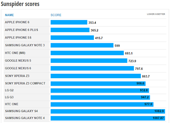 Что касается быстродействия Java-скрипта, то мы будем использовать Sunspider, в котором девайсы получили достаточно спорные результаты: если с Nexus 6 всё понятно, то Note 4 показывает скромные 1087 миллисекунды при использовании браузера Chrome, если же использовать стандартный браузер, то Note 4 показывает уже 380 мс, поэтому нельзя однозначно верить результатам Sunspider. Если посмотреть на результаты в других тестах, то разница между Chrome и стоковым браузером Note 4 минимальна.
