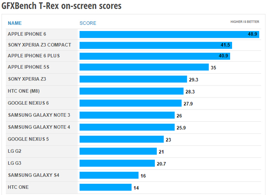 В тесте с выключенным экраном видим интересную ситуацию: устройства обогнали iPhone 6 и все остальные смартфоны и заняли первые две строчки, вот что значит QHD-дисплей при оценке производительности видеоускорителя: 18,8 и 18,5 кадров, тогда как у M8 — 11,8 кадров в секунду, разница очевидна.