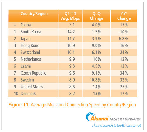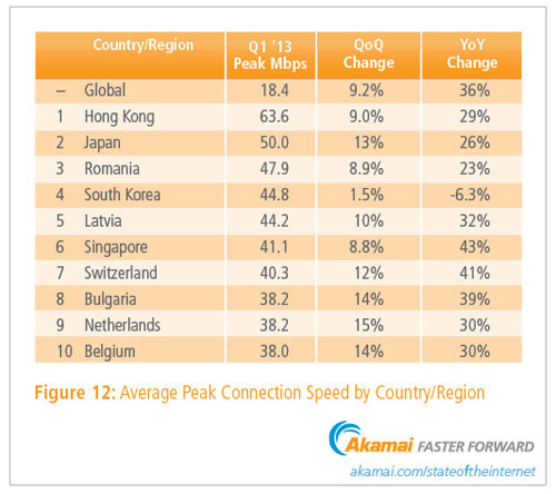 В тройку лидеров с самыми высокими показателями средней скорости доступа в интернет входят Южная Корея (14,2 Мбит/с, −10% по сравнению с IV кварталом 2012 года), Япония (11,7 Мбит/с, +6,8%) и Гонконг (10,9 Мбит/с, +16%).