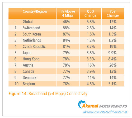 По данным Akamai, Швейцария лидирует по количеству пользователей, подключенных к широкополосному интернету со скоростью выше 4 Мбит/с (88%), второе место у Южной Кореи (87%), третье — у Нидерландов (84%).