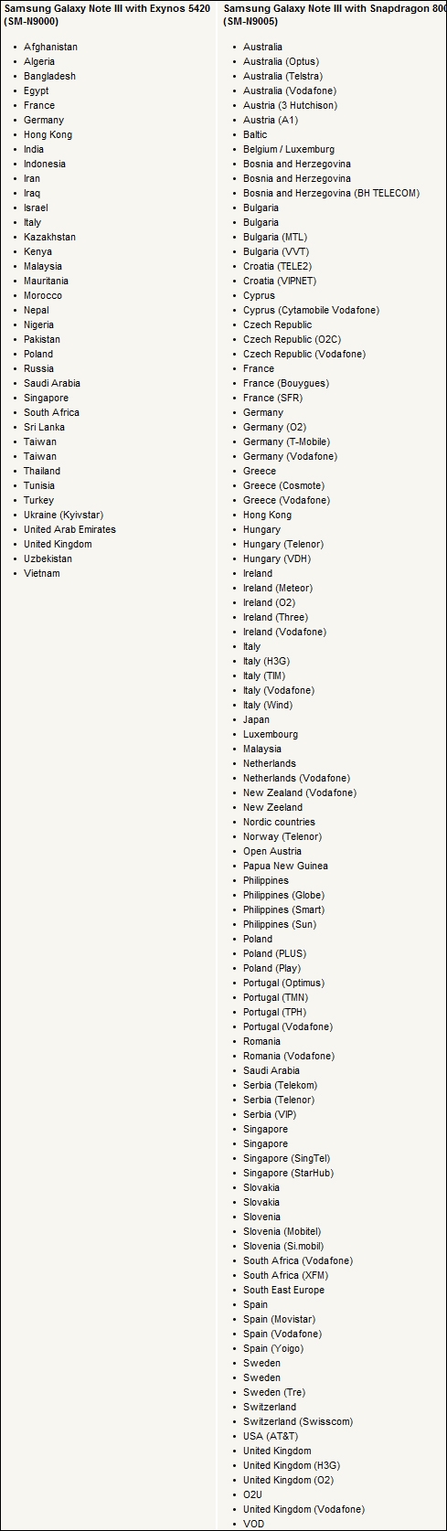 Теперь появились данные о географии продаж версий SM-N900 и SM-N9005. С полным списком стран, в которых будут предлагаться эти модели, можно ознакомиться ниже. Отметим лишь, что в России, по крайней мере поначалу, будет доступна только Exynos-модификация аппарата без поддержки LTE.