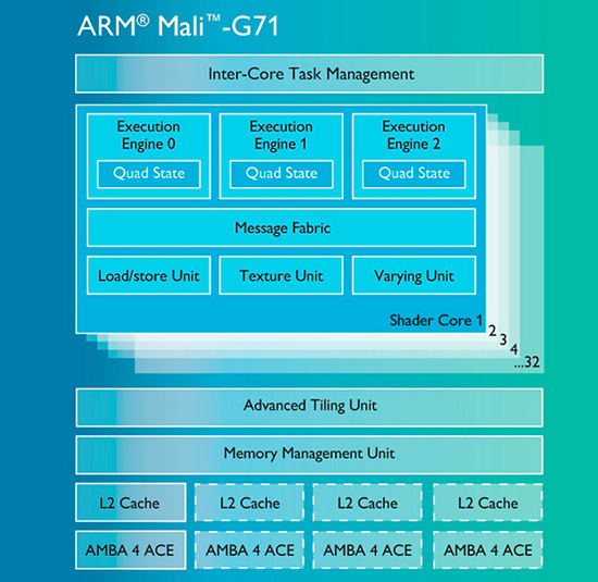 Графический процессор использует новую архитектуру Bifrost, которая фокусируется на работе с разрешением 4K и виртуальной реальности. Mali-G71 должна оказаться в 1.8 раза производительнее Mali-T880. Она совместима с Vulkan, OpenGL ES 3.2, GPU Compute и Android RenderScript.