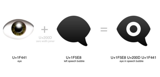 Символ эмодзи, впервые обнаруженный в iOS 9.1 beta 1, был создан путем объединения стандартных значков из юникода 7.0 – глаза и облачка сообщения. Подобная методика сочетания двух смайликов используется при создании семейных пиктограмм, на которых присутствуют два и более персонажей. Отличие от других подобных значков состоит в том, что в разработке нового символа не принимала участие Unicode.