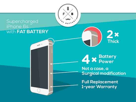 Стартап из Лос-Анджелеса Fat Battery запустил услугу по апгрейду аккумулятора смартфона iPhone 6s, которая позволяет увеличить в четыре раза время автономной работы устройства. Толщина устройства при этом увеличится вдвое, однако выглядеть оно будет элегантнее, чем смартфон, помещенный в жуткий чехол.