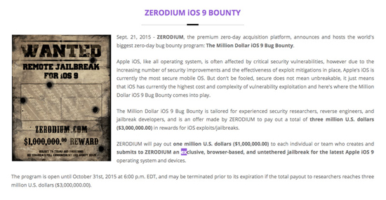 Компания ZERODIUM объявила о готовности заплатить 1 миллионов долларов США за эксклюзивный доступ к джейлбрейку для iOS 9. Эксплоит для новой операционной системы предлагается реализовать в виде веб-сервиса.