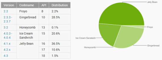 Самая старая присутствующая в статистике версия Android с кодовым именем Froyo и индексом 2.2 держится на удивление неплохо — 2,2% и падение всего на 0,2% за месяц. Похоже, нескоро она пропадет из чарта, ведь небольшие китайские компании успели создать много планшетов на ее основе. Gingerberad все еще занимает второе по популярности место с 28,5% от общего количества устройств. Падение совершенно незначительно, на 2,2%, если темпы сохранятся, он пропадет из статистики не раньше начала 2015 года. Android 3.X Honeycomb до сих пор в чарте с 0,1%, даже не верится, что доля его до сих пор значима.