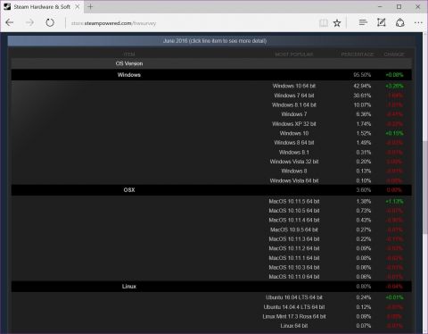 Windows 10 единственная среди всех версий системы улучшила показатели, как 32-, так и 64-разрядный вариант. Геймеры с остальных систем переходят на неё, в том числе ради графического интерфейса DirectX 12 и игр с его поддержкой. Windows в целом выросла на 0,08% до 95,5%.