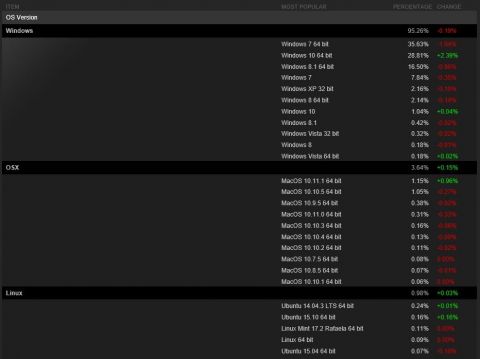16,5% пользователей довольствуются 64-разрядной Windows 8.1 (-0,96%), тогда как 32-битная версия Windows 7 установлена на 7,84% компьютеров с не самыми современными процессорами (-0,35%). На долю всех версий Windows приходится 95,26% геймеров (-0,19%).