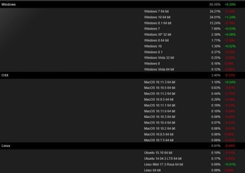 За счёт укрепления позиций Windows 10 выросла совокупная доля разных версий Windows в Steam, достигнув отметки 95,59% (+0,2%). У систем OS X и Linux зафиксирован спад на 0,15% и 0,04% соответственно. В ближайшие годы позициям Windows в качестве лидирующей игровой платформы явно ничего не угрожает, хотя в более отдалённой перспективе новые технологии вроде API Vulkan могут повысить привлекательность конкурирующих платформ для игр.