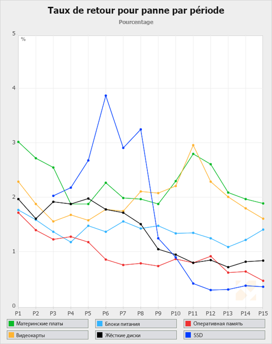 Нижеприведённый график демонстрирует, что со временем (отчёты Hardware France публикуются каждые полгода) производители всё ответственнее относятся к контролю качества продукции.