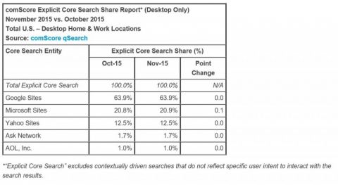 Статистика компании comScore за ноябрь среди настольных компьютеров в США показывает лидерство поисковой системы Google с долей 63,9% против 67%. Система Bing (показанная как Microsoft Sites) занимает почти 21%, несколько месяцев назад преодолев отметку в 20%. Yahoo также выросла, достигнув 12,5%.
