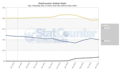 Windows XP в Китае в 2015 году не идёт исключительно на спад, как можно было бы ожидать от неподдерживаемой операционной системы, временами доля её пользователей увеличивается. Про более современные версии, в том числе про Windows 7, можно было бы сказать, что попробовав Windows 10, пользователи вернулись на них, однако обновление с Windows XP до Windows 10 не поддерживается.