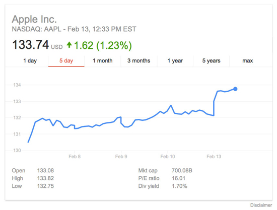 Сегодня после открытия торгов акции Apple торговались по $133,7, то есть выше рекордной стоимости в $133, зафиксированной в феврале 2015 года. По мнению наблюдателей, рост интереса инвесторов к акциям «яблочного» гиганта вызван сочетанием факторов: ожиданием выпуска нового iPhone в нынешнем году, улучшением продаж в Китае, а также ростом доходов от приложений и потокового музыкального сервиса Apple Music.