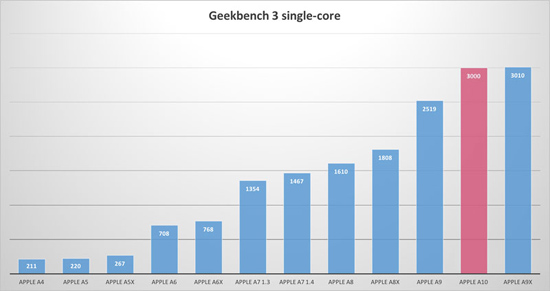 Судя по недавним тестам, Apple A10 демонстрирует результат в 3000 баллов в Geekbench. По сравнению с A9 в iPhone 6s прирост производительности составил внушительные 20%. Таким образом, новая платформа обещает не только серьезный прогресс по части энергосбережения, но и высочайший уровень быстродействия.