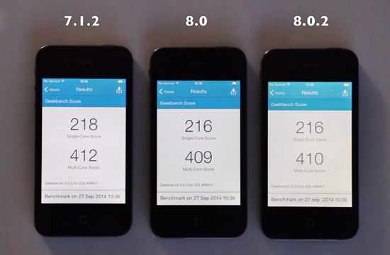 По результатам сравнения iPhone 4s с операционной системой iOS 8.0.2 продемонстрировал едва заметное отставание по скорости работы. Большинство приложений запускаются практически одновременно с моделью на iOS 7. В бенчмарке Geekbench, оценивающем производительность процессора, «эски» с iOS 7.1.2 и iOS 8.0.2 демонстрируют одинаковые результаты.