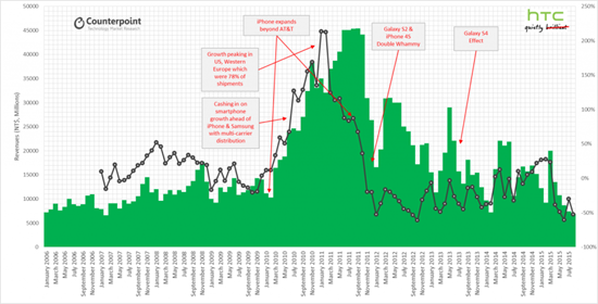 HTC – один з найстаріших смартфонних брендів, чия частка на ринку досягала 10% у третьому кварталі 2011 року. Але тепер компанія втратила позиції лідера і за обсягом поставок апаратів помітно відстає навіть від вендорів другого ешелону, таких як індійська компанія Micromax, китайська Meizu і тайванська ASUS.