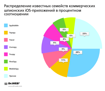 Тогда как при установке шпионской программы злоумышленнику необходимо получить физический доступ к мобильному iOS-устройству, загрузить программу из Интернета при помощи каталога Cydia (который практически всегда автоматически устанавливается при выполнении процедуры jailbreak) и настроить шпиона. Эти приложения работают незаметно для пользователя, скрытно отправляя все собранные данные на удаленный сервер. К каким семействам чаще всего принадлежат вирусы показано на диаграмме.