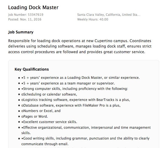 На сайте Apple появилась первая вакансия работников для новой штаб-квартиры. На первом этапе корпорации понадобятся специалисты по логистике со знанием специализированного ПО, включая BearTracks, FileMaker Pro, Numbers или Excel, Pages или Word. Стаж работы не менее 5 лет по специальности в должности менеджера команды или руководителя.