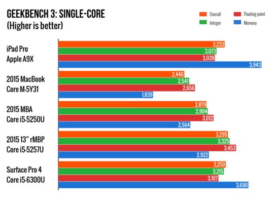 iPad Pro оснащен двухъядерным процессором A9X частотой 2,25 ГГц, что примерно на 300 МГц больше, чем частота A9 в iPhone 6s. Гаджет опережает по производительности все другие iOS-устройства. При этом 12,9-дюймовый планшет Apple по уровню быстродействия в Geekbench сравнялся с 13-дюймовым MacBook Pro и Surface Pro 4 в одноядерном режиме работы. В этом же тесте новинка от Apple выступает лучше, чем 12-дюймовый MacBook и MacBook Air 2015 года выпуска. В многоядерном режиме тестирования iPad Pro превзошел 12-дюймовый MacBook и MacBook Air.