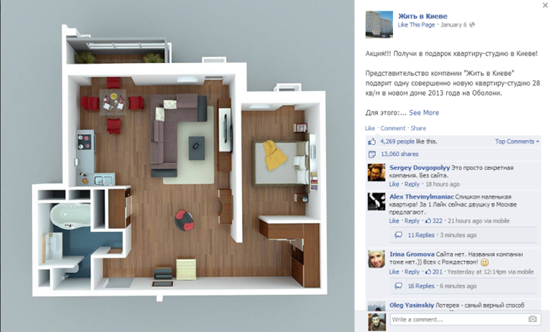 Всего за двое суток с момента создания Facebook-сообщество Жить в Киеве набрало свыше 14 тыс. лайков. Примерно столько же пользователей поделилось новостью о розыгрыше несуществующей киевской квартиры.