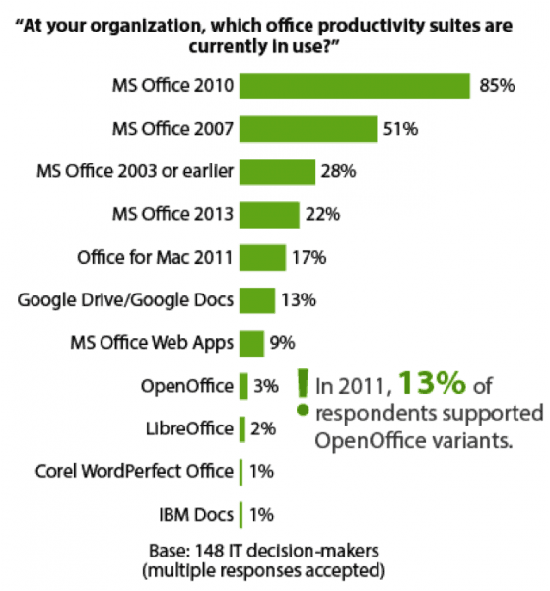 Во-вторых, пользователей свободных офисных пакетов стало гораздо меньше: сейчас их используют всего лишь в 5% компаний, тогда как в 2011 году их использовали 13% компаний.