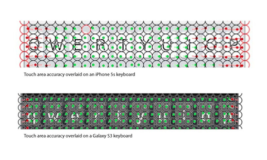 При тестировании было обнаружено, что последние модели iPhone точно определяют только касания в небольшой области, соответствующей примерному расположению виртуальной клавиатуры. Вблизи краев экрана смартфоны показывают крайне плохую точность определения координат, что затрудняет попадание по отдаленным клавишам.