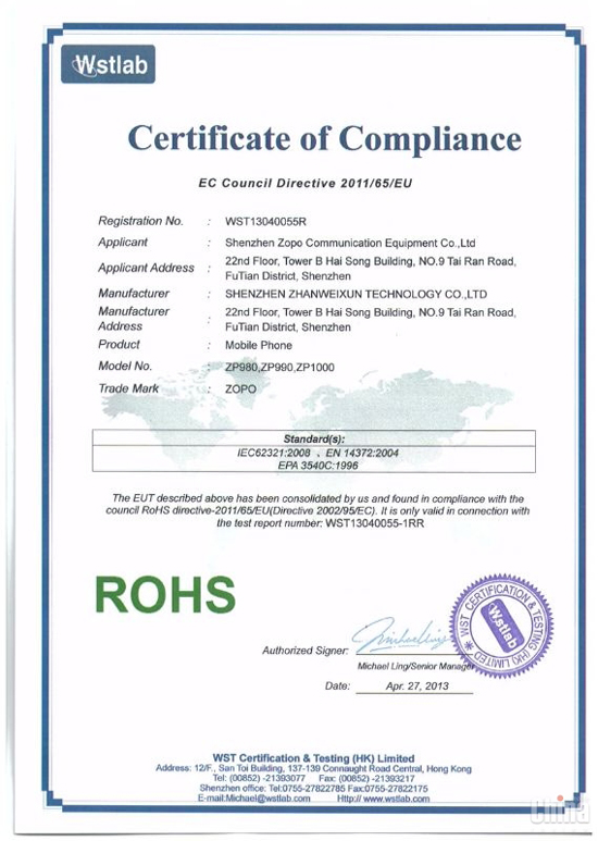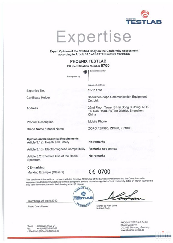 На официальной страничке Zopo в Facebook (Италия) появились документы, где упоминаются три модели Zopo, среди которых две нам не известны. Документы представляют собой европейские сертификаты CE и ROHS, которые выданы немецкой Phoenix-TestLab. В них идет речь о таких смартфонах, как Zopo ZP980, Zopo ZP990 и Zopo ZP1000.