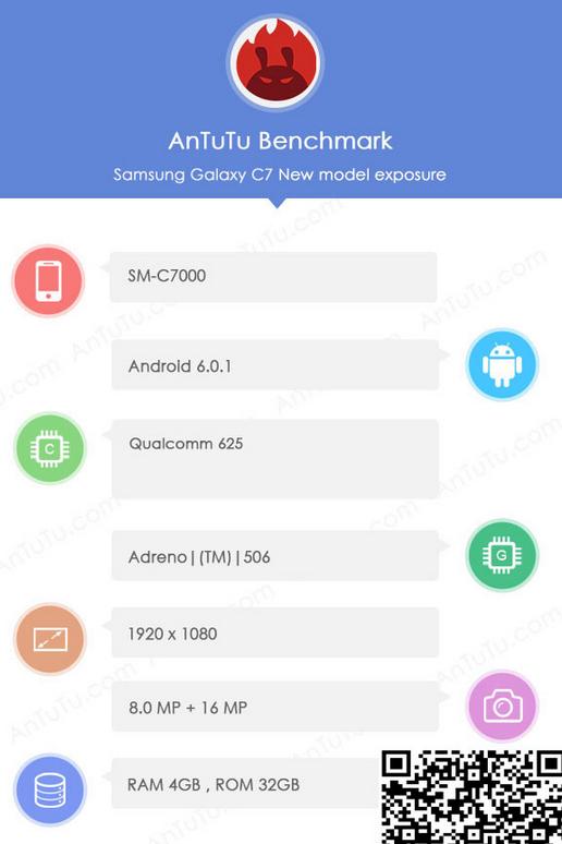 На сайте Weibo опубликован список ключевых характеристик новой модели под номером SM-C7000, которая была замечена в базе данных бенчмарка AnTuTu.