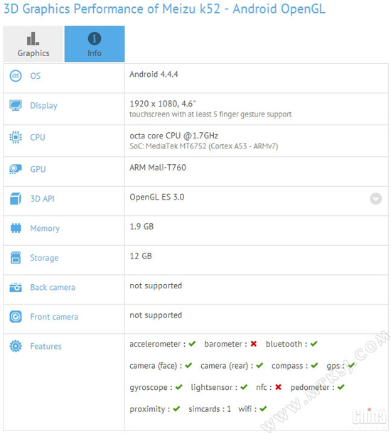 Судя по доступной информации, Meizu K52 представляет собой 4,6-дюймовый смартфон с FHD дисплеем, за работу которого отвечает новый 64-битный 8-ядерный процессор Mediatek MT6752. Кроме того, смартфон получил 2 ГБ RAM, 16 ГБ ROM, одну SIM и ОС Android 4.4.4. Стоит отметить, что несколько недель назад с идентичными характеристиками в GFXbench засветилась новинка Oppo U3. Совпадение? В общем, мы не уверены в точности информации GFXbench, в частности, подозрительный размер дисплея. Похоже, до конца года Meizu исполнит свое обещание и покажет еще парочку новых смартфонов.