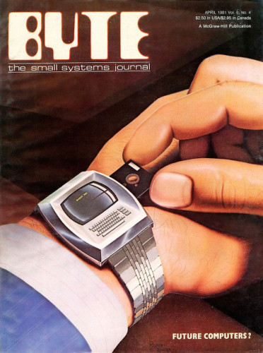 Это реальная обложка журнала Byte апреля 1981 года. И мы видим запястье с часами, которые на самом деле ни что иное, как сильно уменьшенный компьютер. На клавиши qwerty-клавиатуры можно нажимать разве что стилусом. Интерфейс, как видно, предполагался текстовый. На таком наручном ПК вряд ли удалось бы поиграть в стрелялки на двоих в привычном сегодняшнем их виде. Интересны также и миниатюрные дискеты. Интересно, какого объёма информацию туда можно было записать? Ведь это даже не позабытые уже ныне 3,5 дюйма, а пятидюймовки, которые были более капризными в эксплуатации, а также меньшими по объёму.