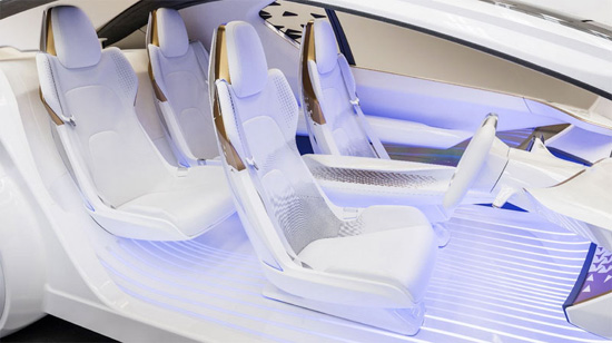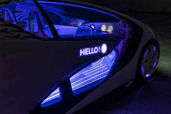 Светодиодная подсветка пронизывает пол и боковины интерьера, может менять цвет и яркость в зависимости от настроения. Навигационные подсказки выводятся прямо на лобовое стекло и дублируются приятным синтезированным голосом. Кроме того, машина может взаимодействовать с людьми с помощью прикосновений, создаваемых подвижными секциями чешуйчатых поверхностей.