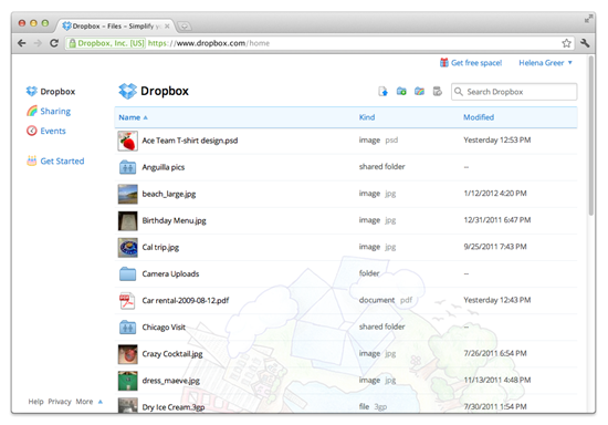 Интерфейс облачного сервиса Dropbox