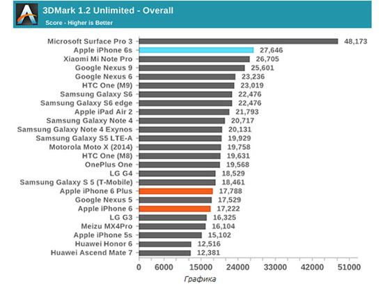 Согласно проведенным тестам, по скорости работы и многим другим показателям iPhone 6s и iPhone 6s Plus занимают лидирующие позиции среди различных планшетов и смартфонов. Опережает «яблочные» новинки только Microsoft SurfacePro 3.