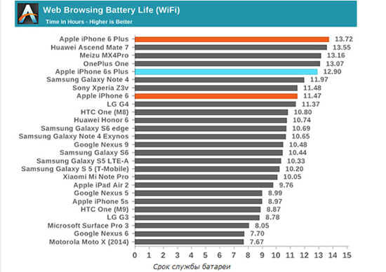Стоит отметить, что некоторые тесты работы с веб-браузерами показали, что продолжительность жизни батареи iPhone 6s Plus уступает аккумулятору iPhone 6 Plus.