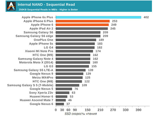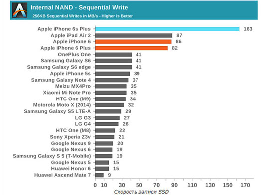 Что касается скорости флэш-накопителей iPhone 6s и iPhone 6s Plus, то новинки получились действительно супербыстрыми благодаря тому, что Apple использовала в смартфонах SSD-контроллер, которым может похвастаться Macbook.