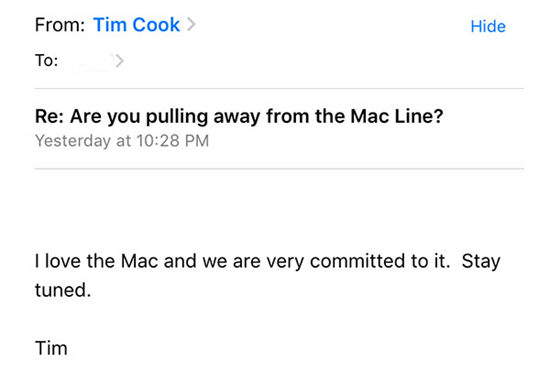 Издание MacRumors опубликовало скриншот переписки Тима Кука и пользователя, пожелавшего остаться неизвестным. В письме главу Apple спросили, собирается ли компания отказываться от линейки Mac.