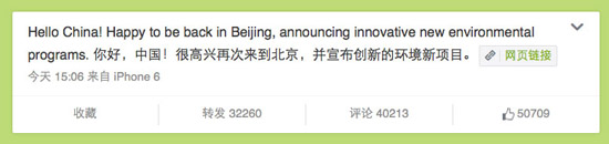 «Привет, Китай! Рад быть снова в Пекине, анонсируя наши новые инновационные экологические программы», – написал Тим Кук в китайском аналоге Twitter. Речь идет об инициативе, осуществляемой совместно со Всемирным фондом дикой природы по защите лесов в Китае. Ее цель – обеспечить нулевое воздействие на окружающую среду за счёт использования только такого количества натуральных волокон, которое есть возможность в дальнейшем восполнить. На момент публикации заметки пост Кук «лайкнули» около 50 000 человек. За несколько часов на аккаунт руководителя Apple подписались около 330 000 пользователей Weibo.