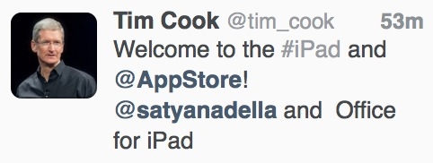 «Добро пожаловать на iPad и в App Store Сатья Наделла и Office для iPad», — заявил Тим Кук в своем «Твиттере».