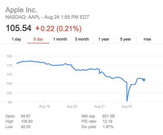 Вчера в связи с нестабильным положением дел в сфере экономики в Китае, случились массовые распродажи ценных бумаг Apple из-за чего индекс компании снизился на 13%. Ближе к вечеру стоимость акций выросла до $105,68, в итоге потеряв около 2% от прежней стоимости.