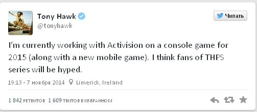 Профессиональный скейтбордист Тони Хоук работает над новой игрой. Об этом спортсмен сообщил в своем твиттере. По его словам, она выйдет на консолях в 2015 году. Более точной информации о сроках выхода и платформах Хоук не предоставил.