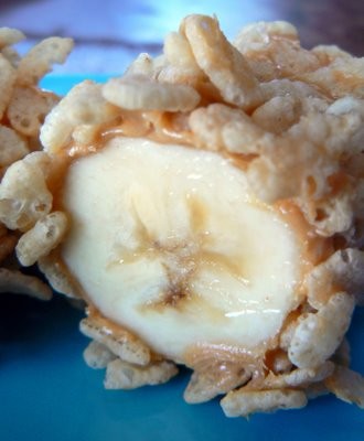 «Суши на завтрак: бананы, покрытые арахисовым маслом и нарезанные на кусочки, размером в один укус, а также завернутые Rice Krispies».