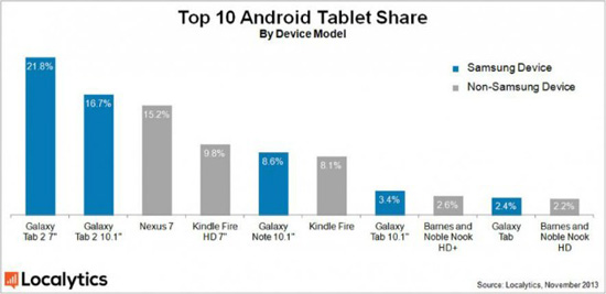 В планшетах лидерство также принадлежит Samsung, однако о монополии пока речь не идет. Самыми популярными стали планшеты средней линейки Galaxy Tab второго поколения - семи и десятидюймовый. Третье место удалось отвоевать дешевому и качественному Google-планшету Nexus 7 первого поколения.