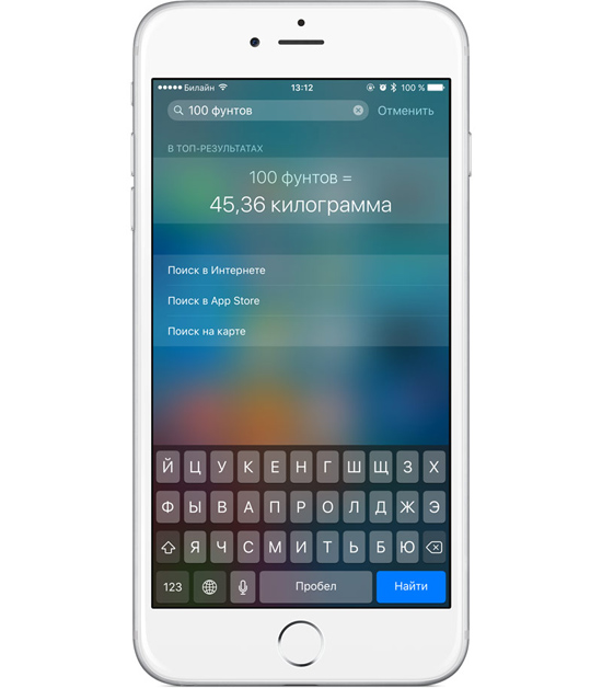 Вычисления в Spotlight: просто наберите что-то типа «100 фунтов» и вы получите эквивалентное значение в килограммах.