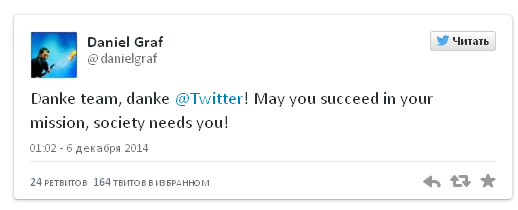 - Спасибо @Twitter, спасибо команде! Желаю вам добиться успеха в вашей миссии, вы нужны обществу, - написал Дэниел Граф на своей странице в Twitter.