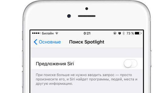 В iOS 9 дополнительно нагружает гаджет новой функцией «Предложения Siri». Операционная система в фоновом режиме следит за действиями пользователя, чтобы выдавать подсказки на странице Spotlight. Вернуть прежнее быстродействие iOS можно отключив эту опцию. Настройка «Предложения Siri» находится в меню Настройки –> Основные –> Поиск Spotlight.