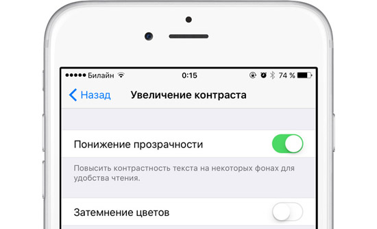 Особый шик программной оболочке Apple придает прозрачность. Многие элементы iOS 9 выполнены с эффектом объемности – слоями над основным интерфейсом. При этом все, что ниже, становится размытым, как за матовым стеклом. Этот эффект наблюдается в ОС повсеместно, включая Центр уведомлений, Пункт управления, верхнюю панель с часами и другие элементы. Отключить полупрозрачность UI можно, зайдя в меню Настройки –> Основные –> Универсальный доступ –> Увеличение контраста -> Понижение прозрачности. По умолчанию переключатель стоит в положении «Выкл».
